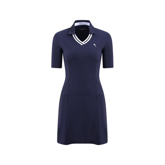 Kleid aus dem bi-elastischen, maschenfesten und formbeständigen Dry-Matic-Gewebe „Power Swing“ mit Sunblock-Ausrüstung. Die funktionale und frische Optik machen sie für die ganze Saison geeignet. Varsity-Look mit kontrastierenden Paspeln am Ausschnitt, mit leicht ausgestelltem Rock und halblangen Ärmeln. Taillierter Schnitt mit zwei nicht sichtbaren Reißverschlüssen an den Seiten. Sun Block Dry Matic Comfort 4-Way-Stretch Power Swing